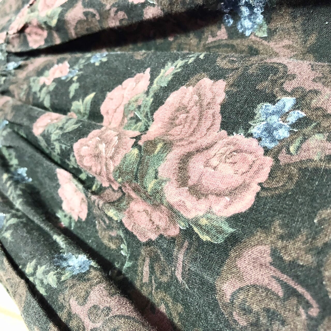 ダークトーンの生地に、くすみカラーの花柄。袖にギャザーが入っていたりとシックな印象の素敵なデザイン。