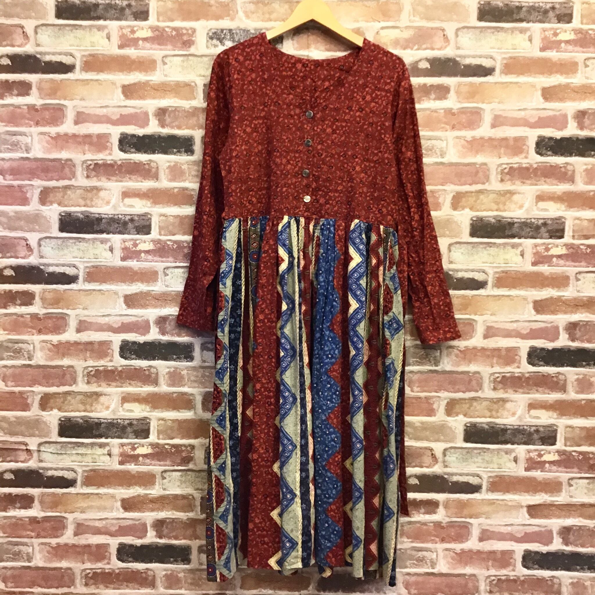 #レディース#古着#古着屋#インポート古着#インポート#ジョージアンドキューピー#ジョージ&キューピー#ヴィンテージ#vintage #長袖 #総柄ワンピース #ロング丈 #エンジ色