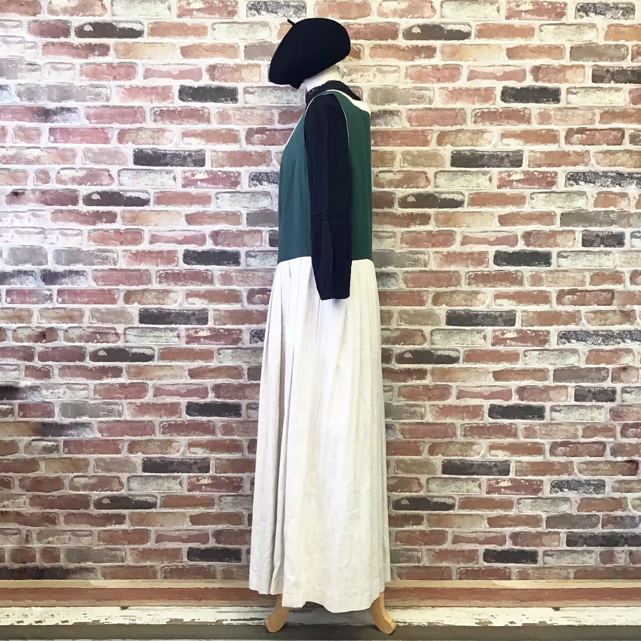 #レディース#古着#古着屋#インポート古着#インポート#ジョージアンドキューピー#ジョージ&キューピー#ヴィンテージ#vintage #ロングワンピース #リネンワンピース #キャミワンピース #ロング丈 #マキシ丈 #前開き #チロルワンピース #緑色 #ツートーンカラー