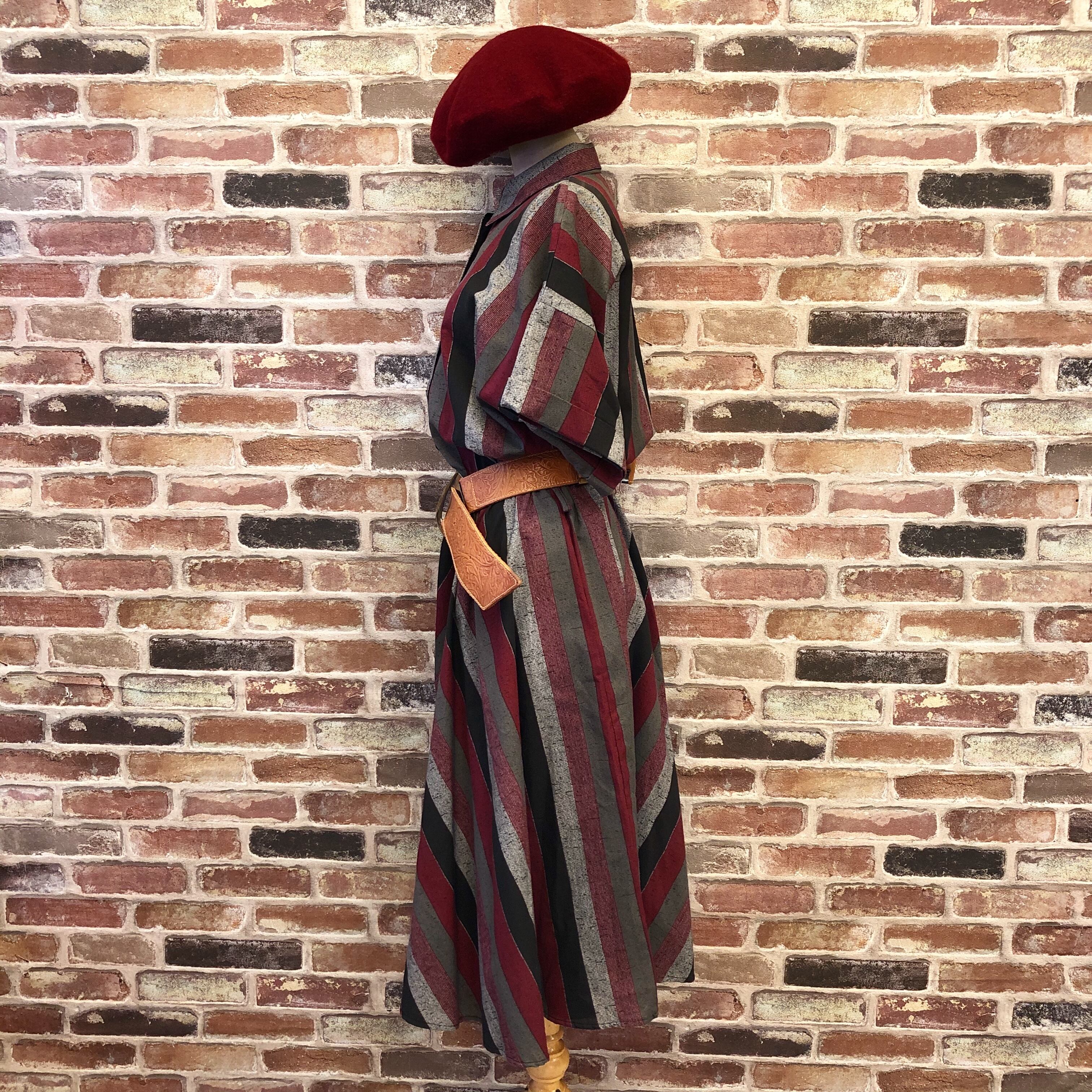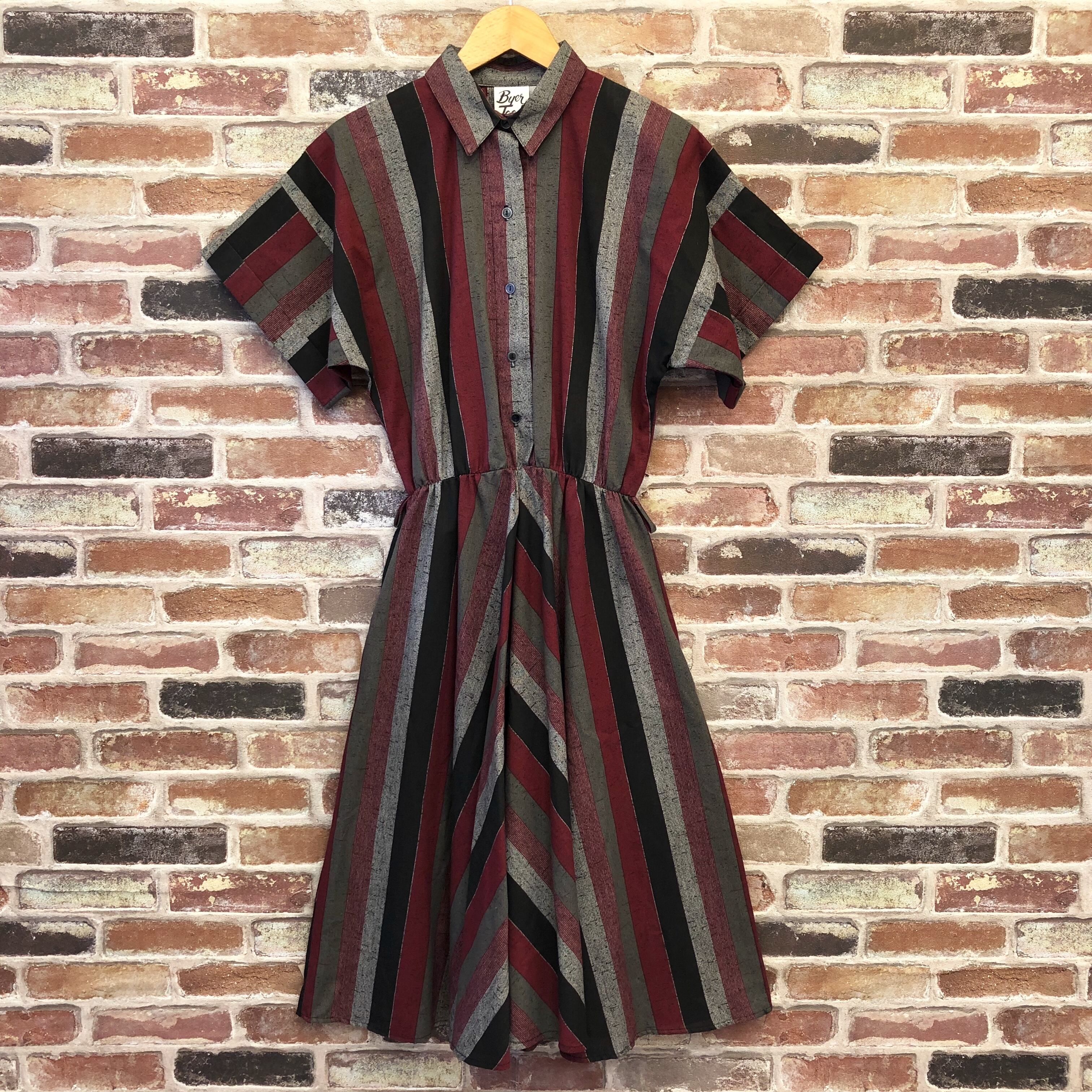 #レディース#古着#古着屋#インポート古着#インポート#ジョージアンドキューピー#ジョージ&キューピー #ヴィンテージ #vintage #半袖ワンピース #襟付きワンピース #ドロップショルダー #黒色 #ワイン色 #えんじ #ストライプワンピース #シックカラー