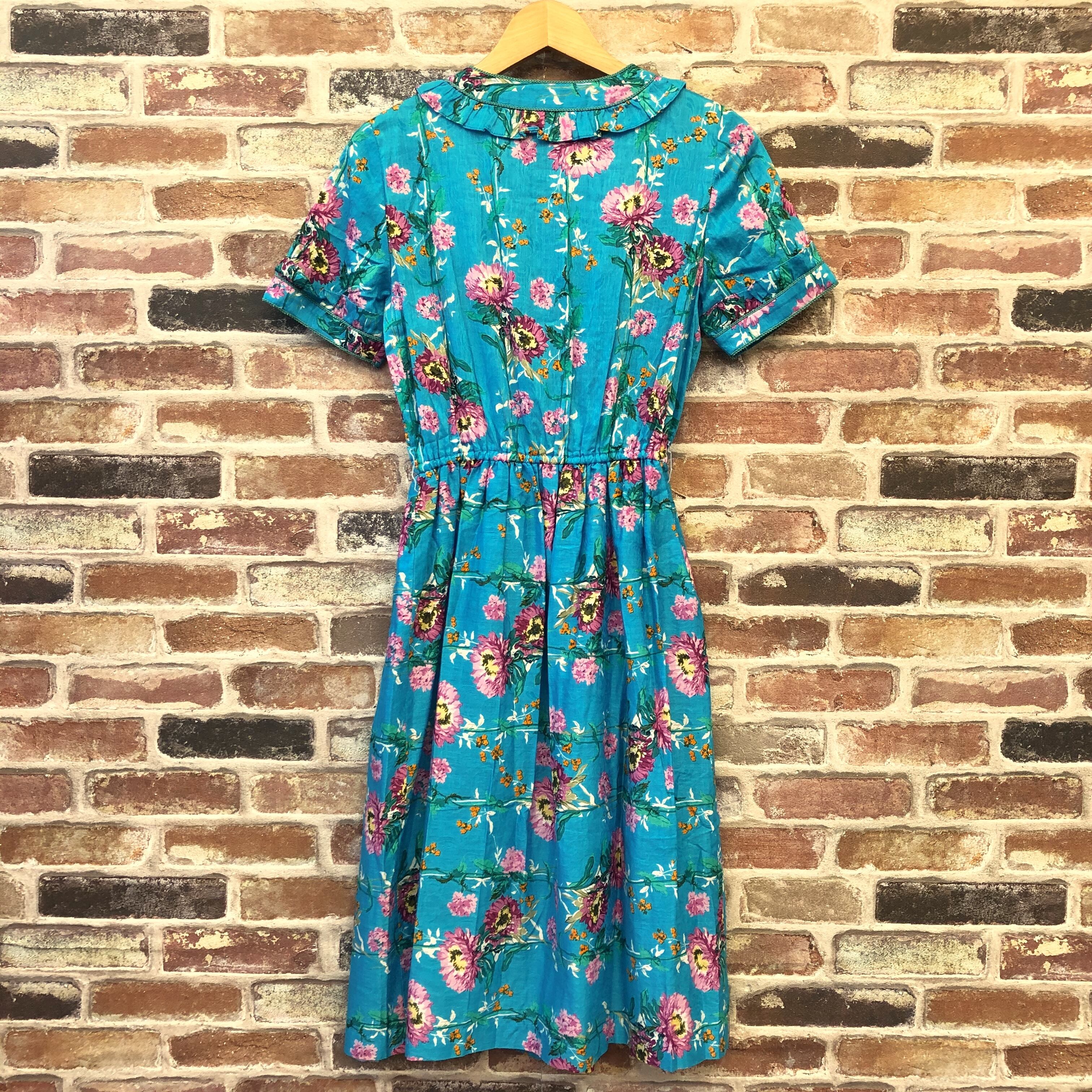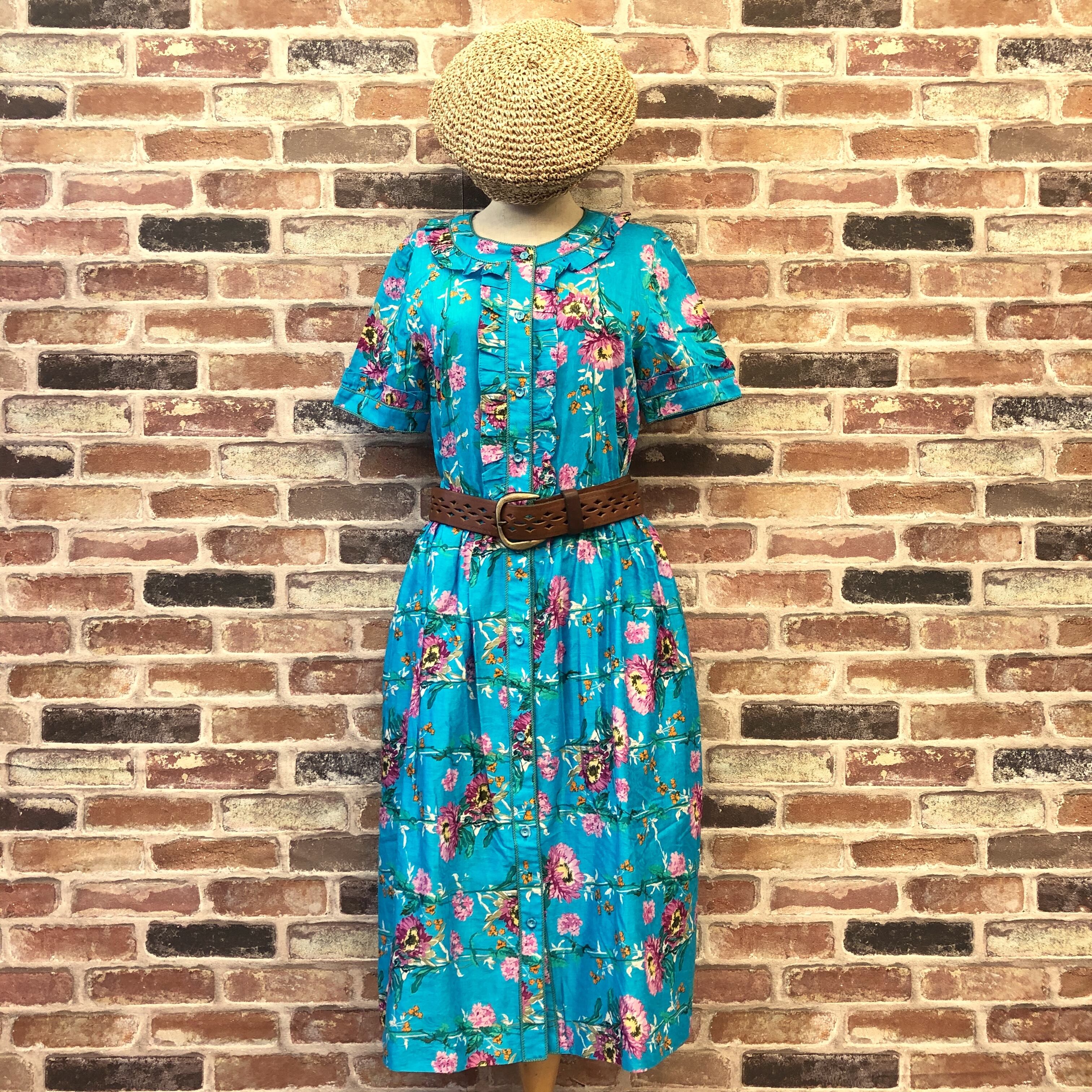 #レディース#古着#古着屋#インポート古着#インポート#ジョージアンドキューピー#ジョージ&キューピー #ヴィンテージ #vintage #古着ワンピ #半袖ワンピース #ウエストゴム #水色 #総柄 #フリル付き