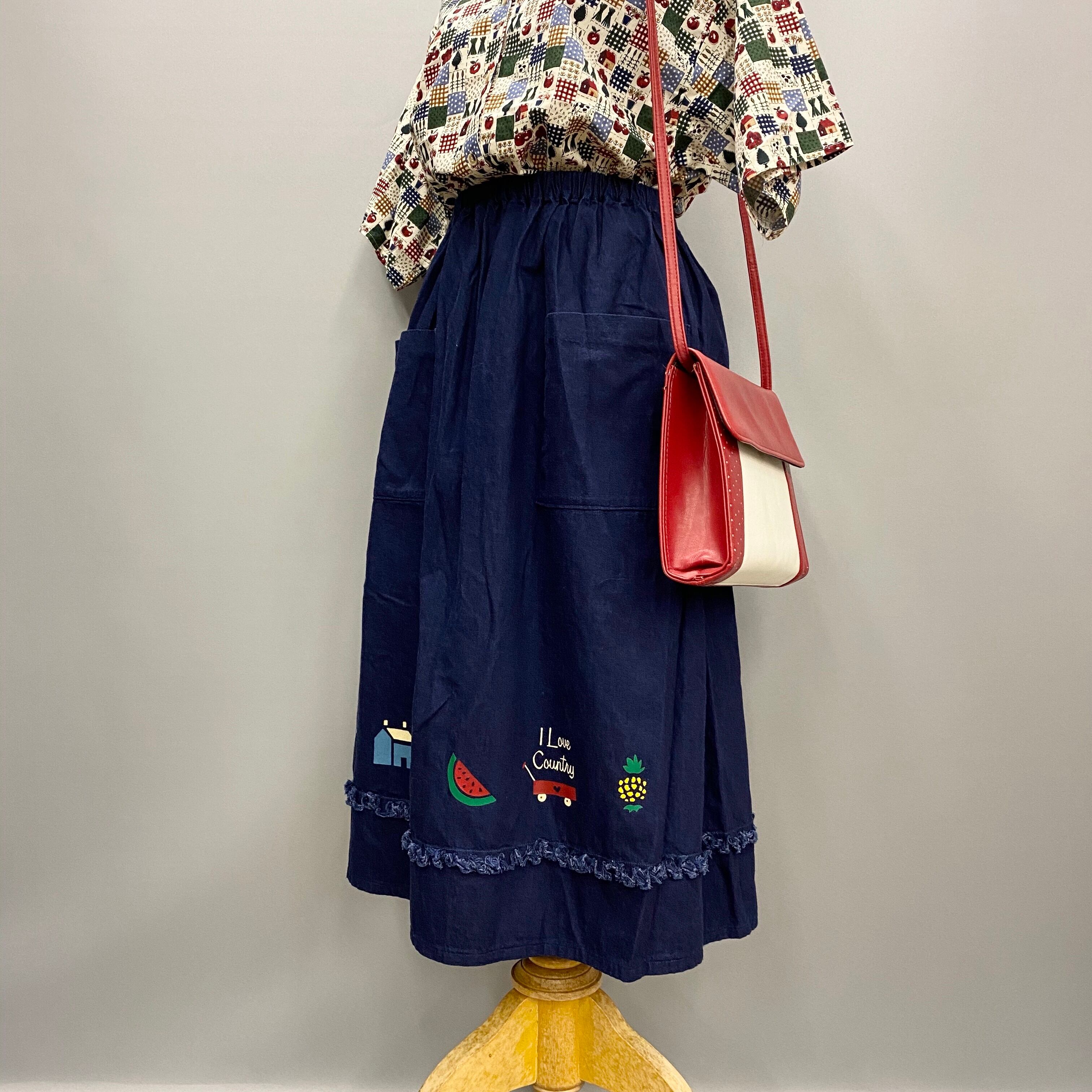 #レディース#古着#古着屋#インポート古着#インポート#ジョージアンドキューピー#ジョージ&キューピー#ヴィンテージ#vintage #ロングスカート #デニムスカート #ロング丈 #ミディアム丈 #ミドル丈 #イラスト #スイカ柄 #フルーツ柄 #濃紺 #紺色