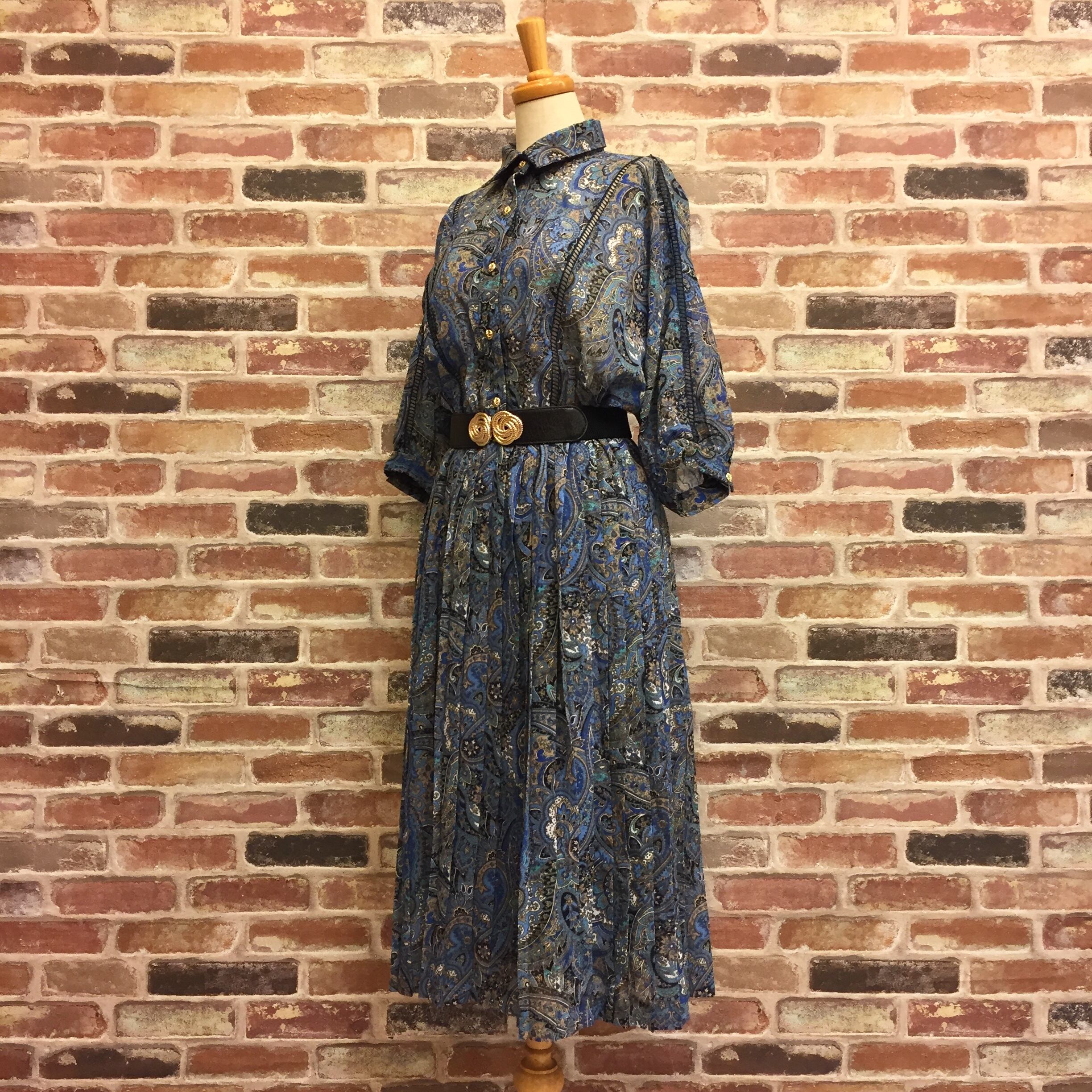ブルーのベースカラーが落ち着いた印象のペイズリー柄ワンピースです。