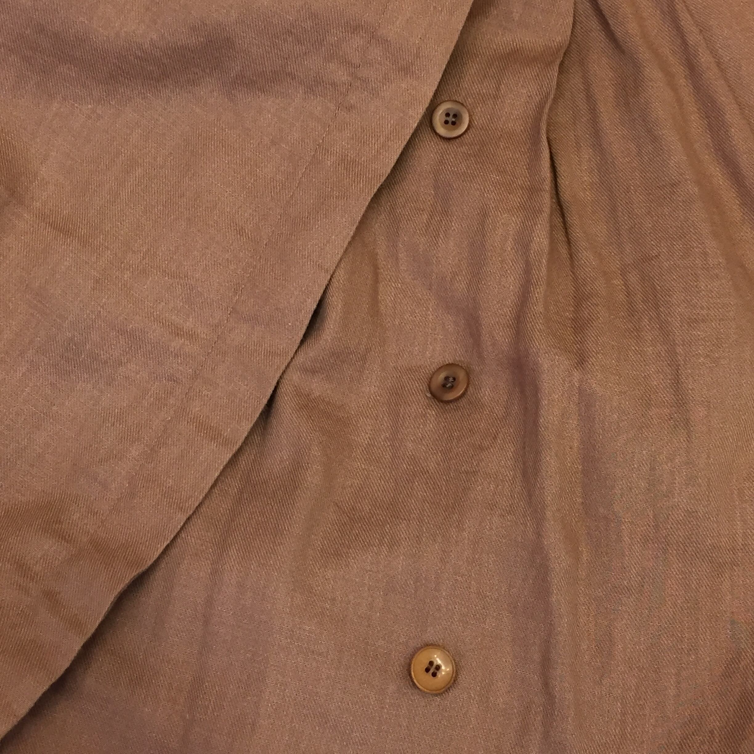 コットンと麻の混紡生地で、サラッとしており軽い着心地に感じます。ウエスト部分はゴムになっていますが、やや硬めであまり伸びません。細身のシルエットになります。
