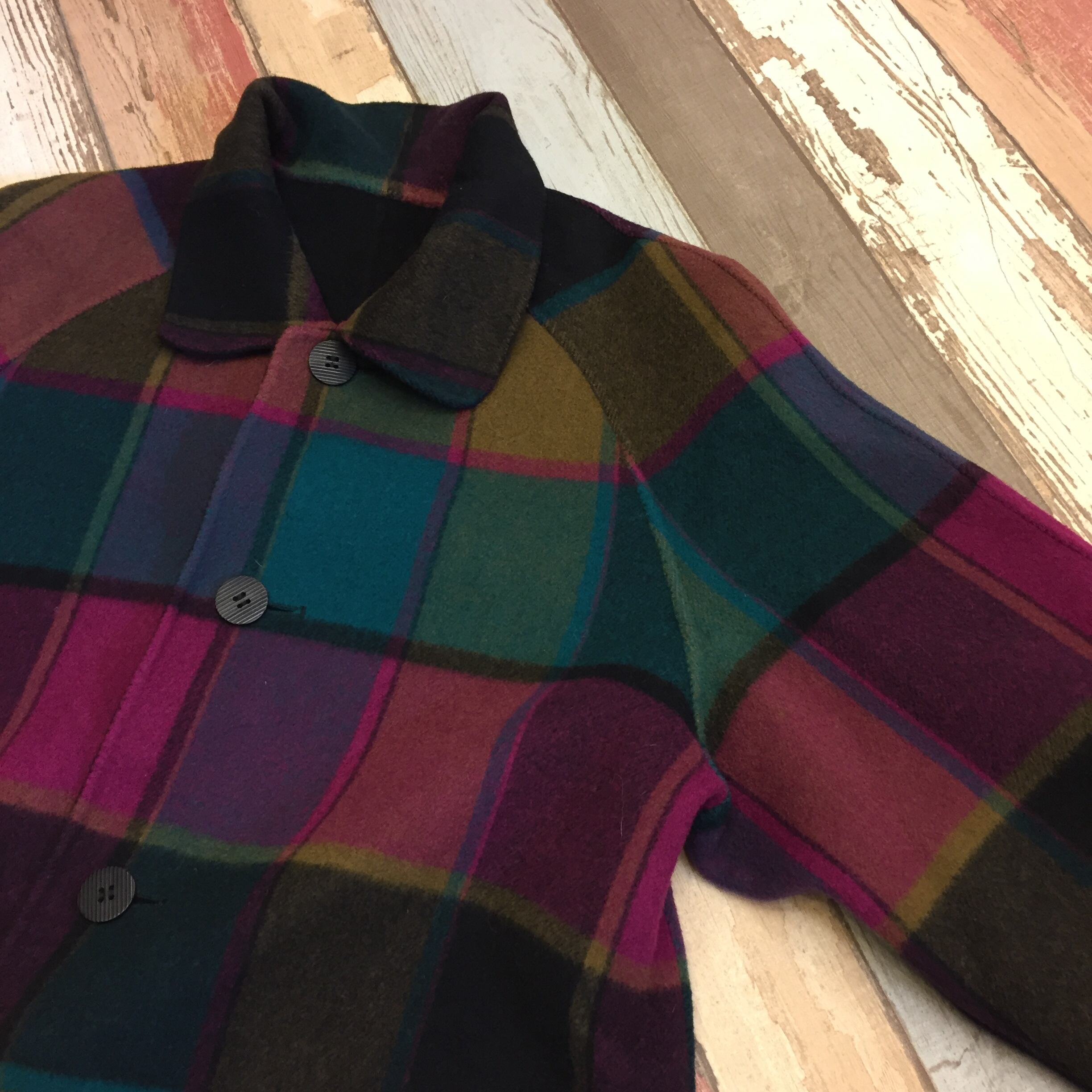 カラフルなチェック柄とブラックのリバーシブルコートです。